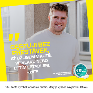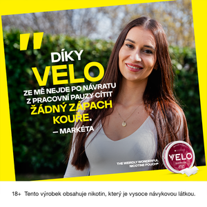 Nikotinové sáčky VELO představují moderní způsob užívání nikotinu. Neobsahují žádný tabák, méně barví zuby* a jsou bez zápachu a kouře**. VELO můžeš užívat kdekoliv a kdykoliv: v MHD, kanceláři i v letadle. Na výběr máš z mnoha různých příchutí v různých intenzitách. Stačí si jen vybrat tu svou.